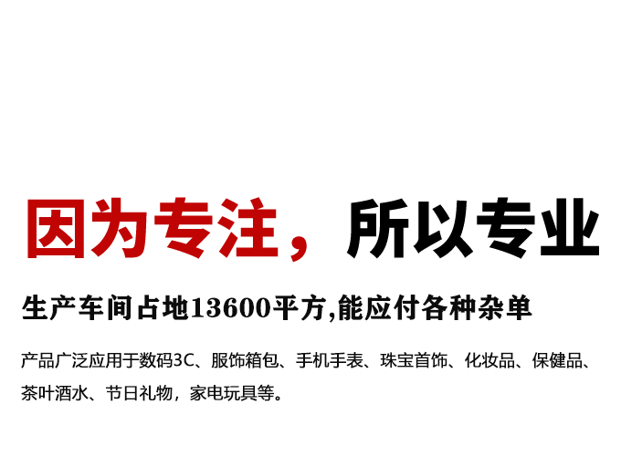 產(chǎn)品廣泛應(yīng)用于數(shù)碼3C,服飾箱包、手機(jī)手表、珠寶首飾、化妝品、保健品、茶葉酒水、節(jié)日禮物,家電玩具等。